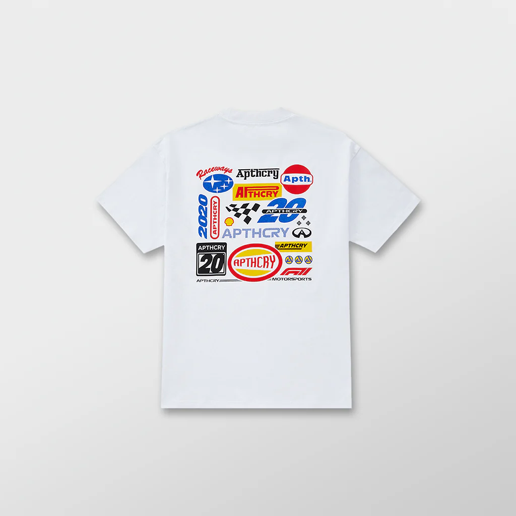 Heavyweight solid white tee features black, red, blue, and yellow racing inspired decals/logos.
